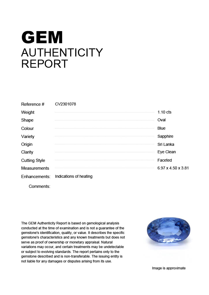 1.10ct Blue Oval Sri Lanka SapphireCarat: 1.10 ctType: SapphireCut: OvalColour: BlueOrigin: Sri LankaComment: Heated6.97 x 4.50 x 3.81 mm