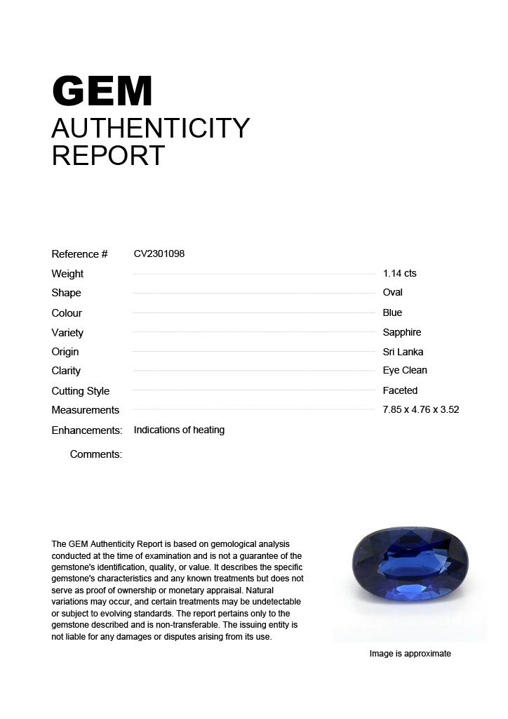 1.14ct Blue Oval Sri Lanka SapphireCarat: 1.14 ctType: SapphireCut: OvalColour: BlueOrigin: Sri LankaComment: Heated6.50 x 4.99 x 3.84 mm