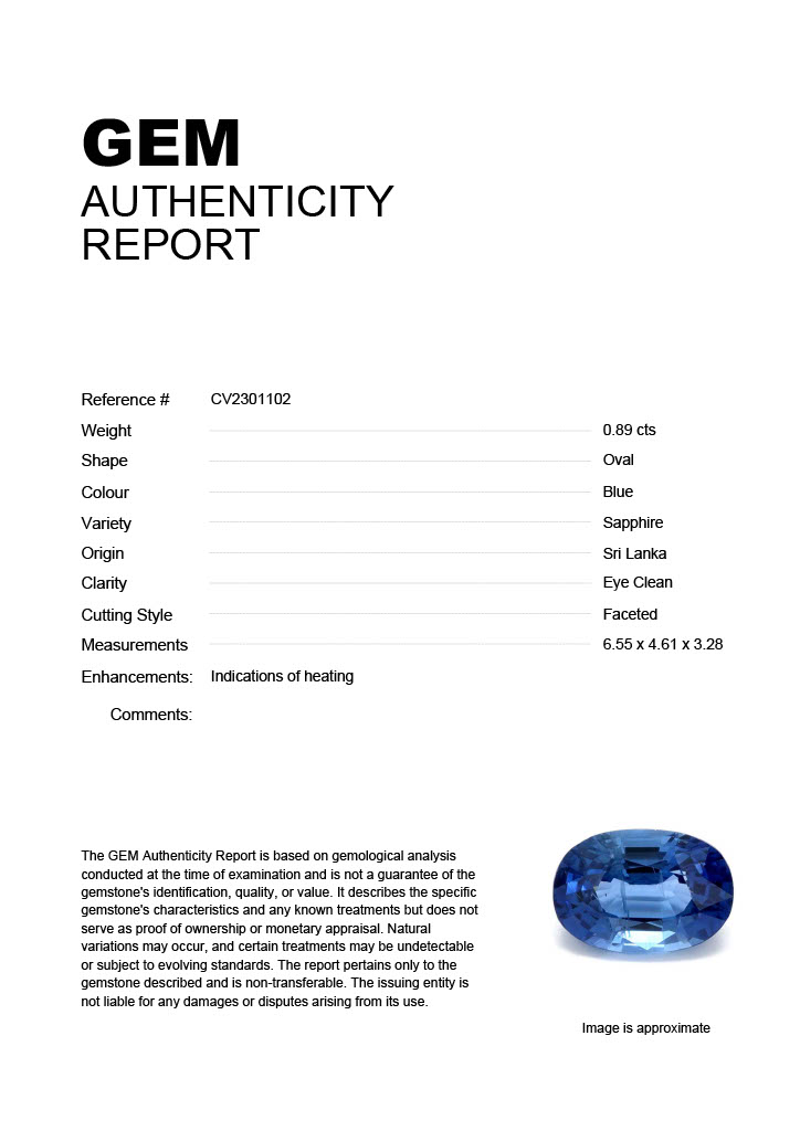 0.89ct Blue Oval Sri Lanka SapphireCarat: 0.89 ctType: SapphireCut: OvalColour: BlueOrigin: Sri LankaComment: Heated6.55 x 4.61 x 3.28 mm