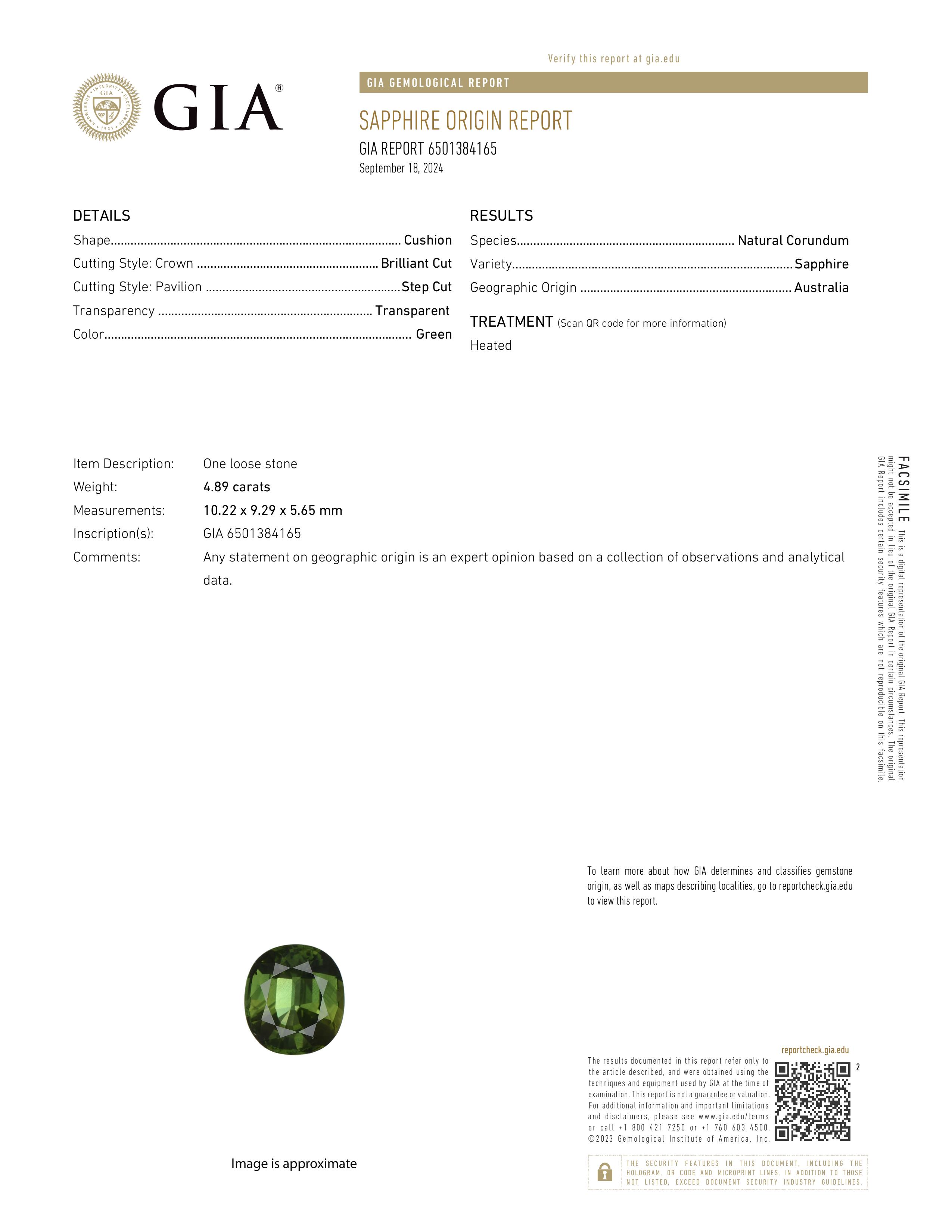 GIA: 6501384165 Stock ID: ASC2403014.89ct Green Cushion Australia SapphireCarat: 4.89 ctType: SapphireCut: CushionColour: GreenOrigin: AustraliaComment: Heated10.22 x 9.29 x 5.65 mm