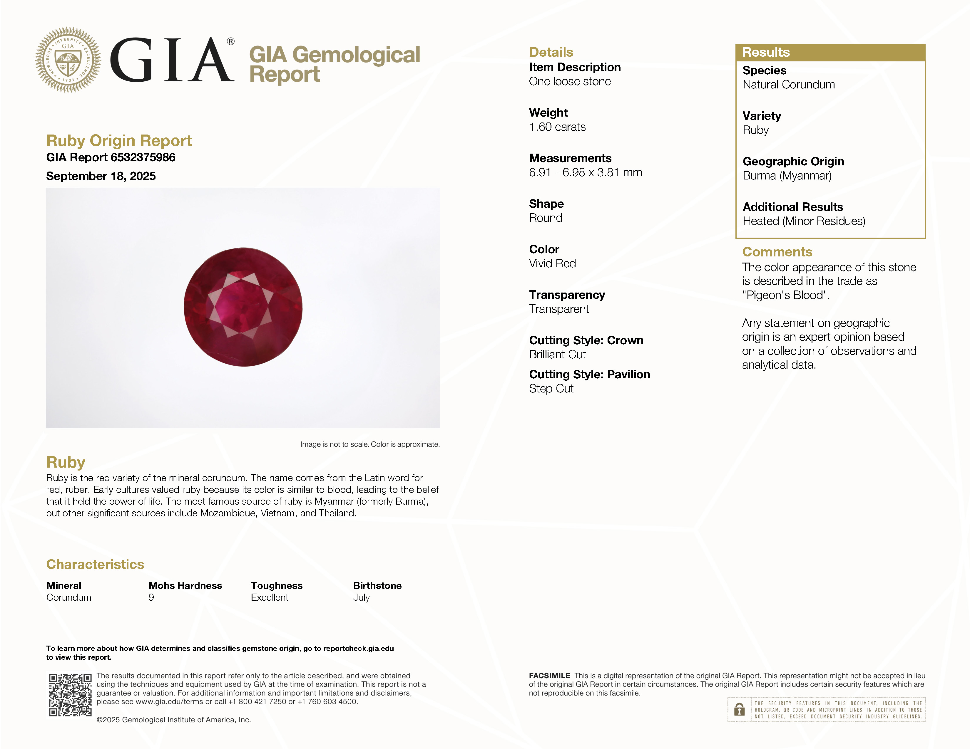 GIA: 6532375986 Stock ID: RR2403011.60ct Red Round Myanmar (Burma) RubyCarat: 1.60 ctType: RubyCut: RoundColour: RedOrigin: Myanmar (Burma)Comment: Heated6.98 x 6.91 x 3.81 mm