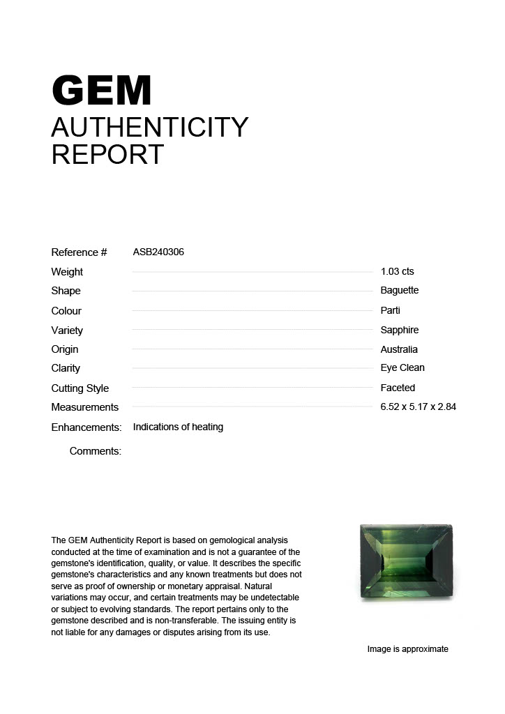 1.03ct Parti Baguette Australia SapphireCarat: 1.03 ctType: SapphireCut: BaguetteColour: PartiOrigin: AustraliaComment: Heated6.52 x 5.17 x 2.84 mm