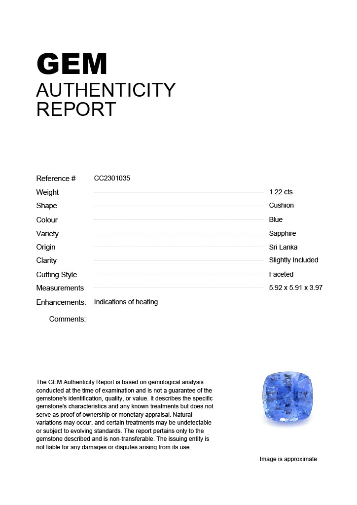 1.22ct Blue Cushion Sri Lanka SapphireCarat: 1.22 ctType: SapphireCut: CushionColour: BlueOrigin: Sri LankaComment: Heated5.92 x 5.91 x 3.97 mm