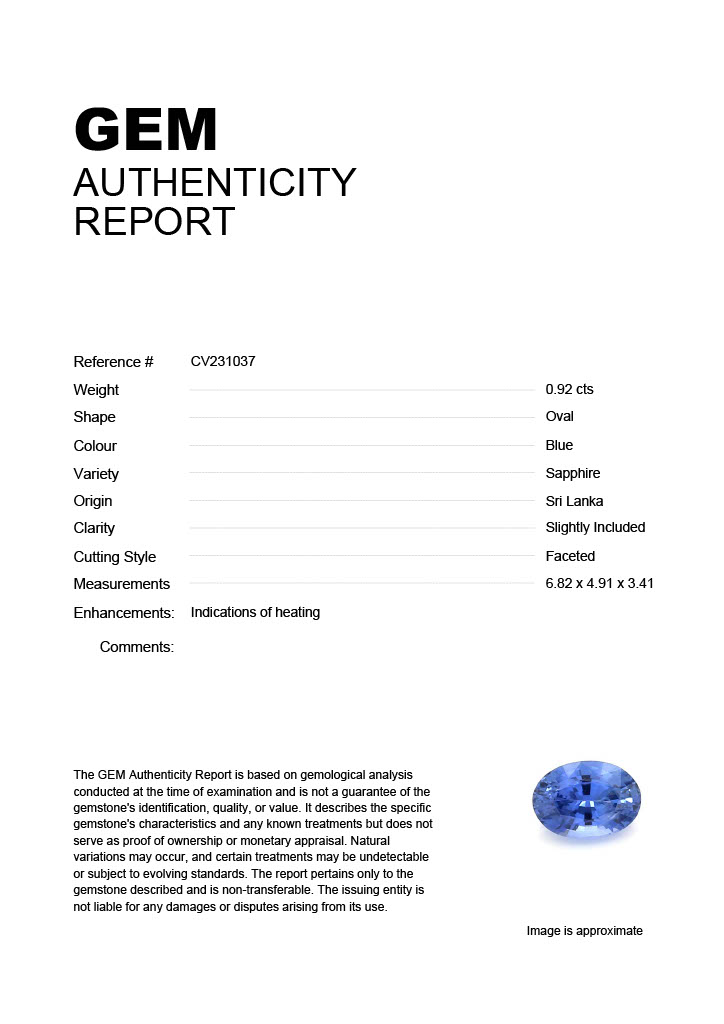0.92ct Blue Oval Sri Lanka SapphireCarat: 0.92 ctType: SapphireCut: OvalColour: BlueOrigin: Sri LankaComment: Heated6.82 x 4.91 x 3.41 mm