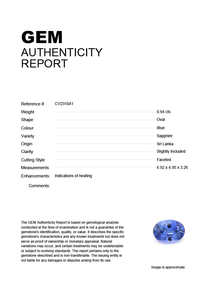 0.94ct Blue Oval Sri Lanka SapphireCarat: 0.94 ctType: SapphireCut: OvalColour: BlueOrigin: Sri LankaComment: Heated6.92 x 4.95 x 3.26 mm
