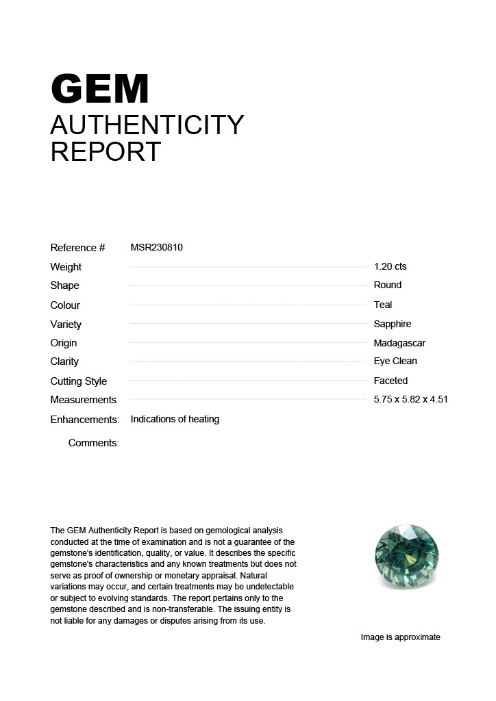1.20ct Teal Round Madagascar SapphireCarat: 1.20 ctType: SapphireCut: RoundColour: TealOrigin: MadagascarComment: Heated5.75 x 5.82 x 4.51 mm