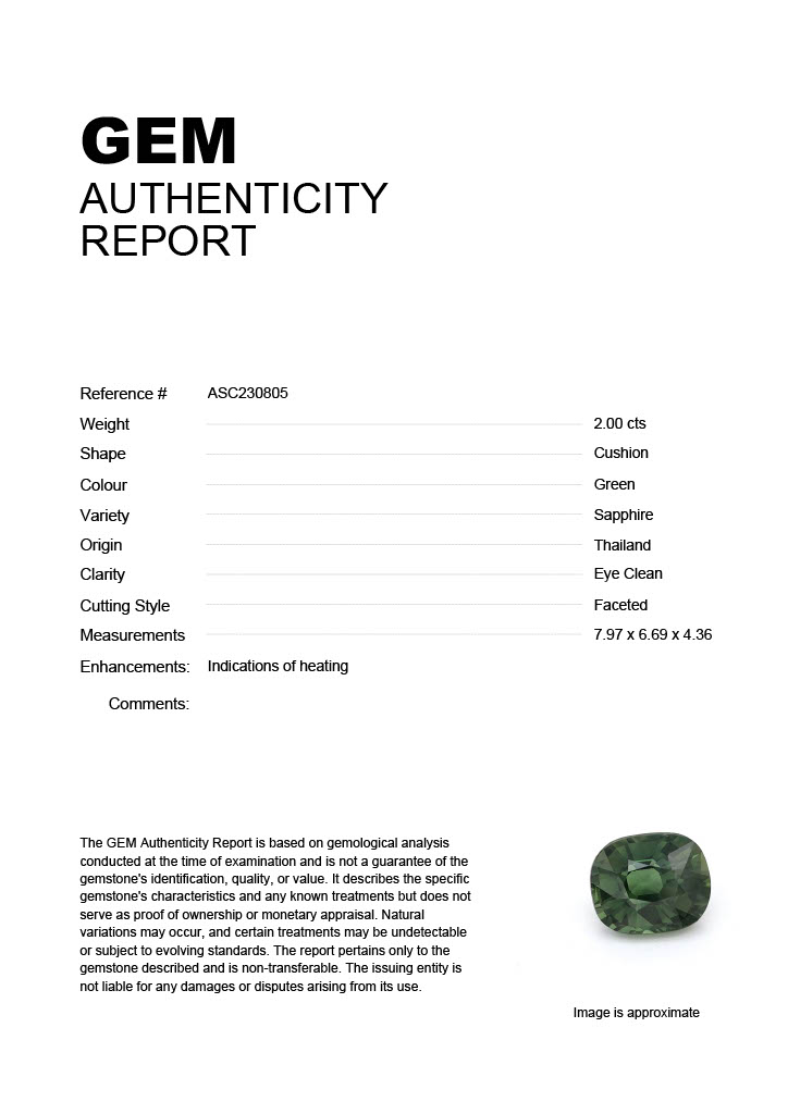 2.00ct Green Cushion Thailand SapphireCarat: 2.00 ctType: SapphireCut: CushionColour: GreenOrigin: ThailandComment: Heated7.97 x 6.69 x 4.36 mm