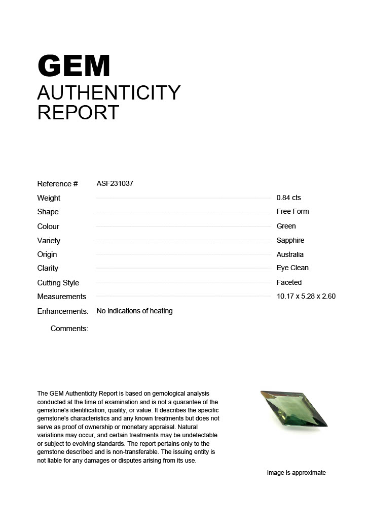 0.84ct Green Other Australia SapphireCarat: 0.84 ctType: SapphireCut: OtherColour: GreenOrigin: AustraliaComment: Not Heated10.17 x 5.28 x 2.60 mm