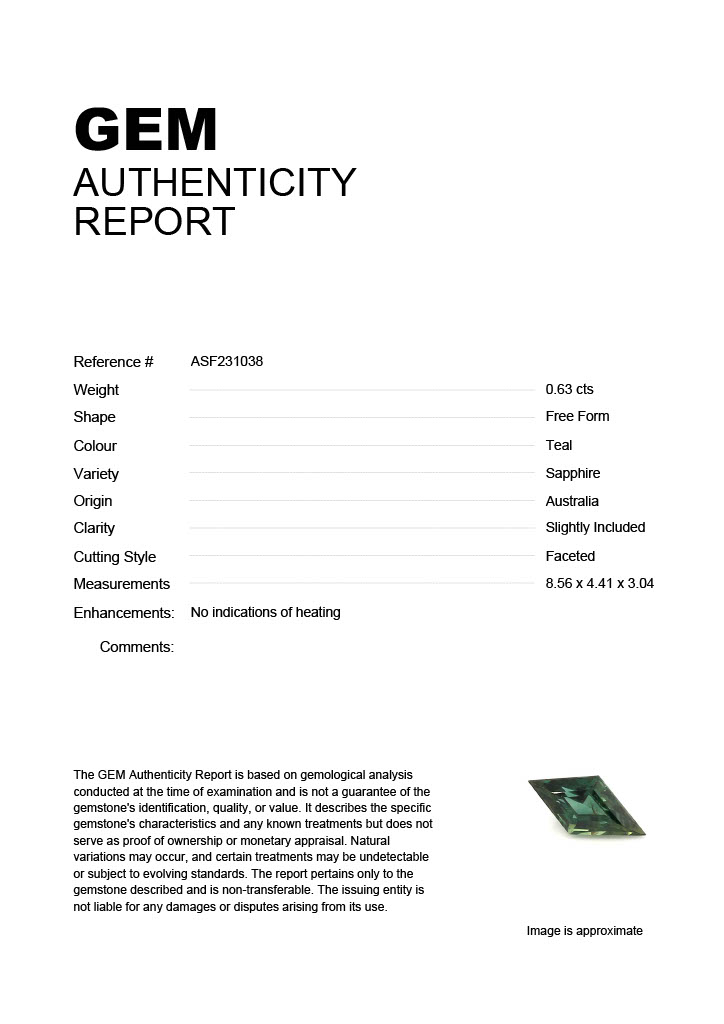 0.63ct Teal Other Australia SapphireCarat: 0.63 ctType: SapphireCut: OtherColour: TealOrigin: AustraliaComment: Not Heated8.56 x 4.41 x 3.04 mm