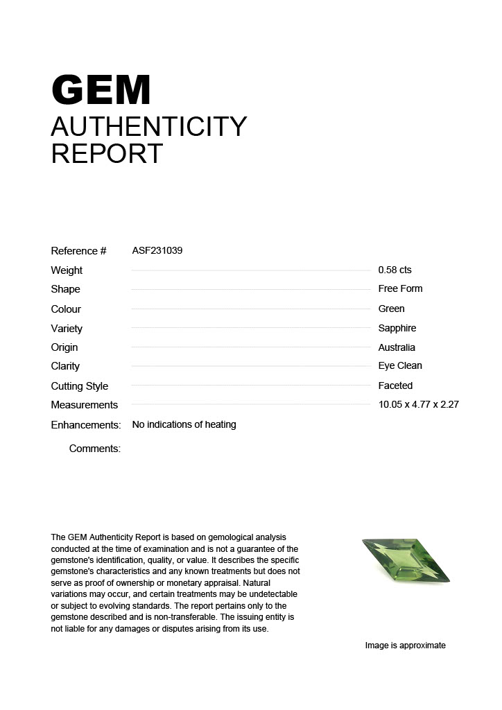 0.58ct Green Other Australia SapphireCarat: 0.58 ctType: SapphireCut: OtherColour: GreenOrigin: AustraliaComment: Not Heated10.05 x 4.77 x 2.27 mm