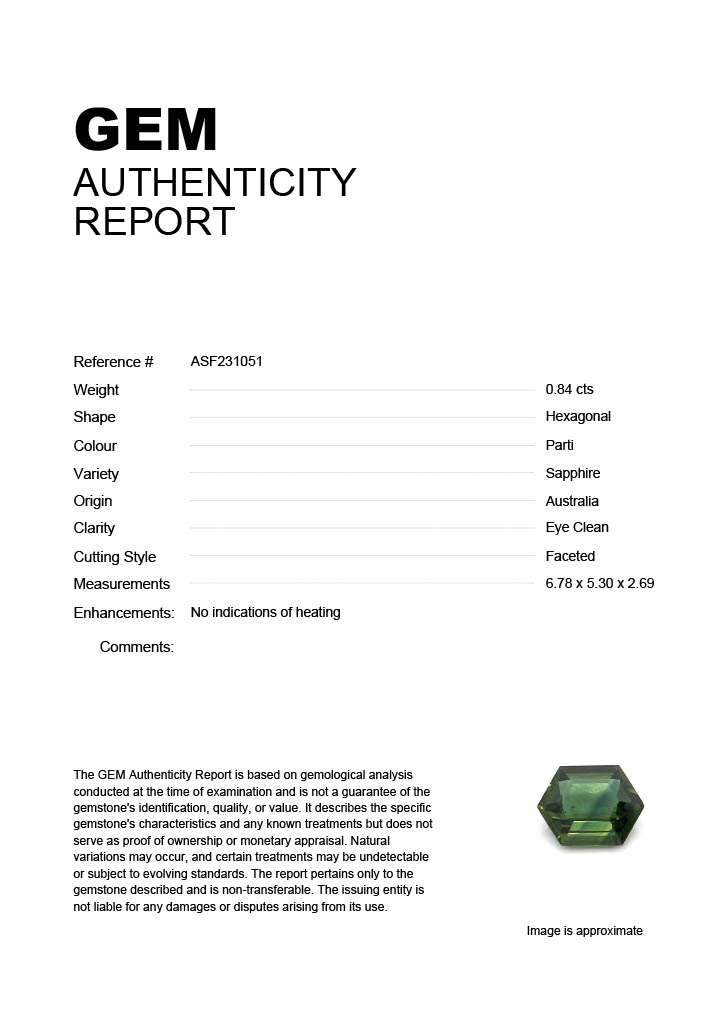 0.81ct Parti Hexagonal Australia SapphireCarat: 0.81 ctType: SapphireCut: HexagonalColour: PartiOrigin: AustraliaComment: Not Heated6.90 x 5.14 x 2.85 mm