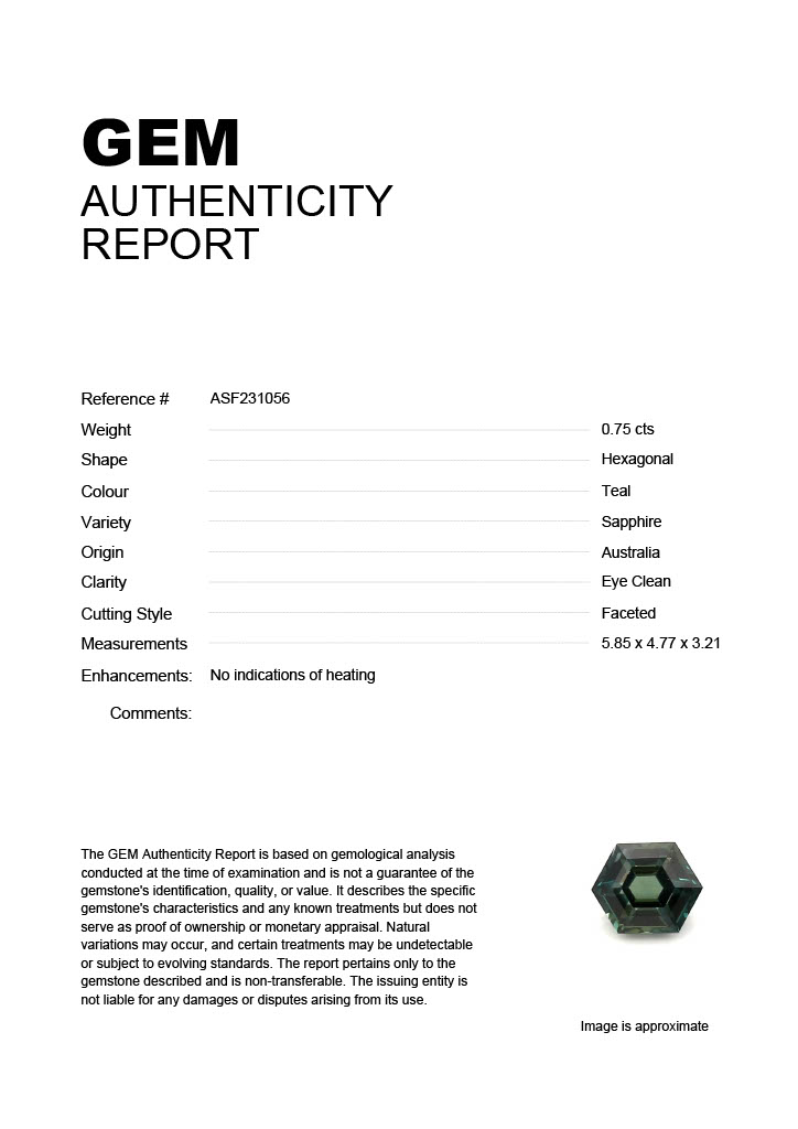 0.75ct Teal Hexagonal Australia SapphireCarat: 0.75 ctType: SapphireCut: HexagonalColour: TealOrigin: AustraliaComment: Not Heated5.85 x 4.77 x 3.21 mm