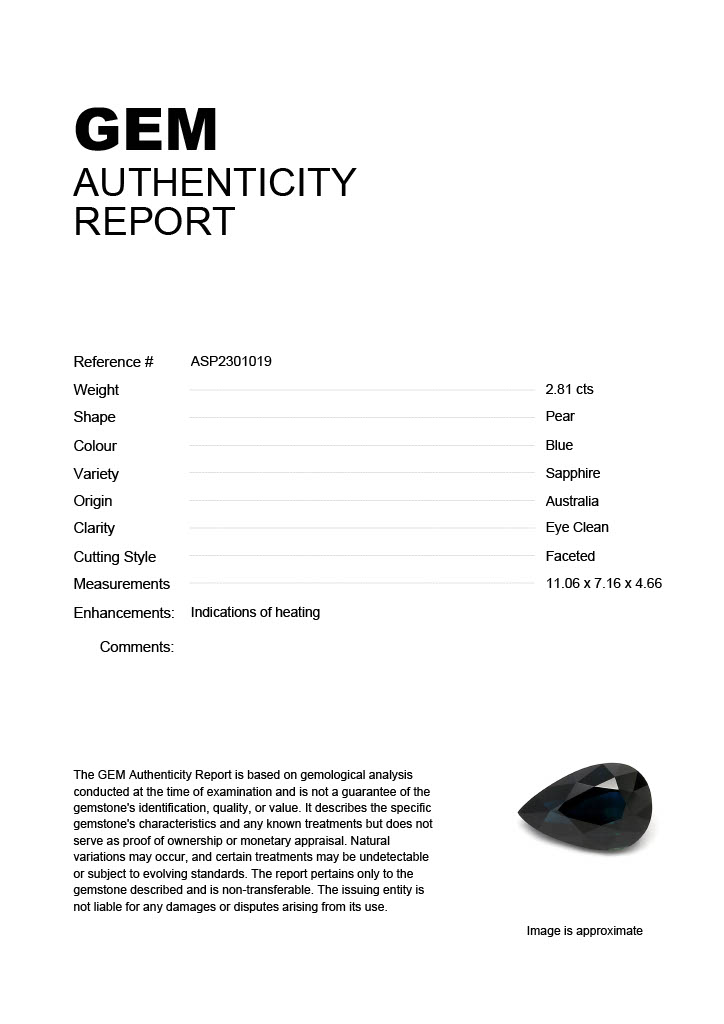 GEM: ASP2301019 Stock ID: ASP23010192.81ct Blue Pear Australia SapphireCarat: 2.81 ctType: SapphireCut: PearColour: BlueOrigin: AustraliaComment: Heated11.06 x 7.16 x 4.66 mm
