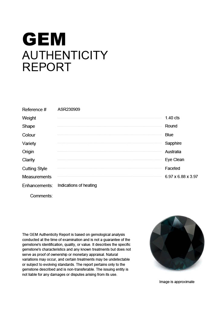 1.40ct Blue Round Australia SapphireCarat: 1.40 ctType: SapphireCut: RoundColour: BlueOrigin: AustraliaComment: Heated6.97 x 6.88 x 3.97 mm