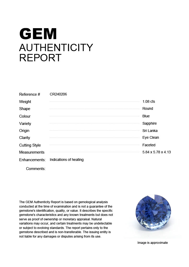 1.08ct Blue Round Sri Lanka SapphireCarat: 1.08 ctType: SapphireCut: RoundColour: BlueOrigin: Sri LankaComment: Heated5.84 x 5.78 x 4.13 mm