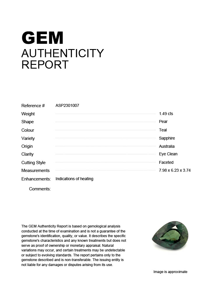 GEM: ASP2301007 Stock ID: ASP23010071.49ct Teal Pear Australia SapphireCarat: 1.49 ctType: SapphireCut: PearColour: TealOrigin: AustraliaComment: Heated7.98 x 6.23 x 3.74 mm