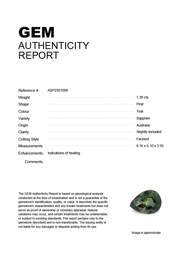 GEM: ASP2301008 Stock ID: ASP23010081.39ct Teal Pear Australia SapphireCarat: 1.39 ctType: SapphireCut: PearColour: TealOrigin: AustraliaComment: Heated8.16 x 6.10 x 3.55 mm