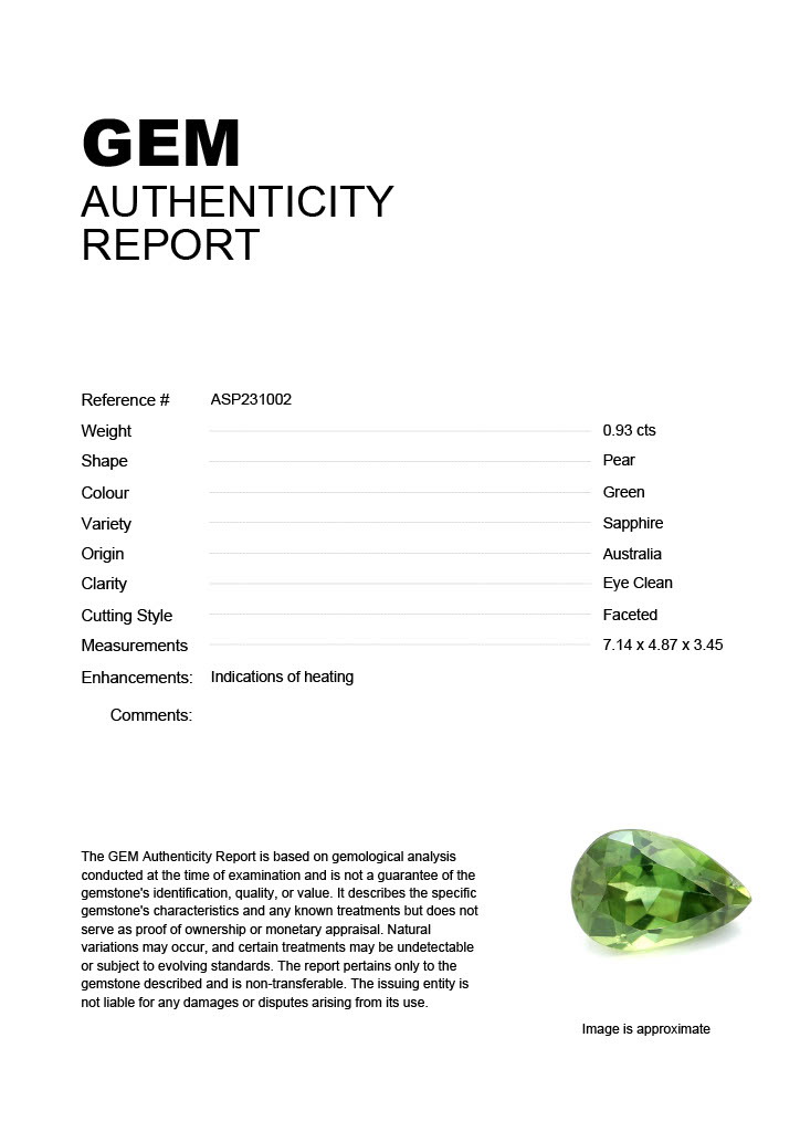 0.93ct Green Pear Australia SapphireCarat: 0.93 ctType: SapphireCut: PearColour: GreenOrigin: AustraliaComment: Heated7.14 x 4.87 x 3.45 mm