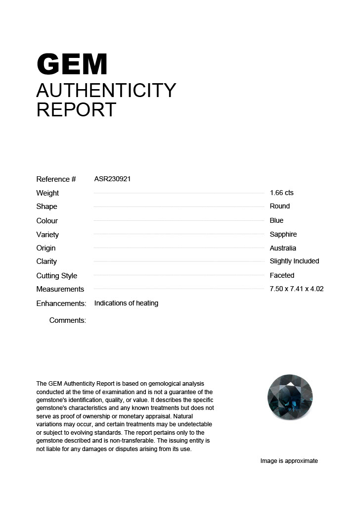 1.66ct Blue Round Australia SapphireCarat: 1.66 ctType: SapphireCut: RoundColour: BlueOrigin: AustraliaComment: Heated7.50 x 7.41 x 4.02 mm