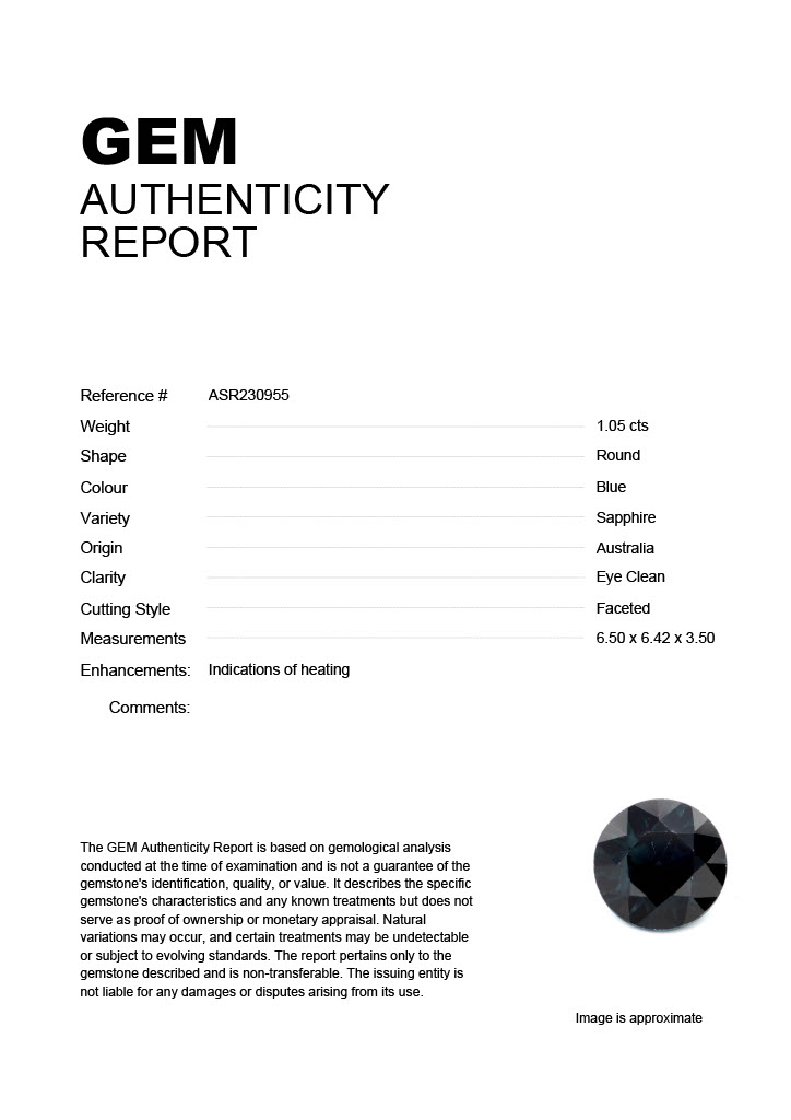1.05ct Blue Round Australia SapphireCarat: 1.05 ctType: SapphireCut: RoundColour: BlueOrigin: AustraliaComment: Heated6.50 x 6.42 x 3.50 mm