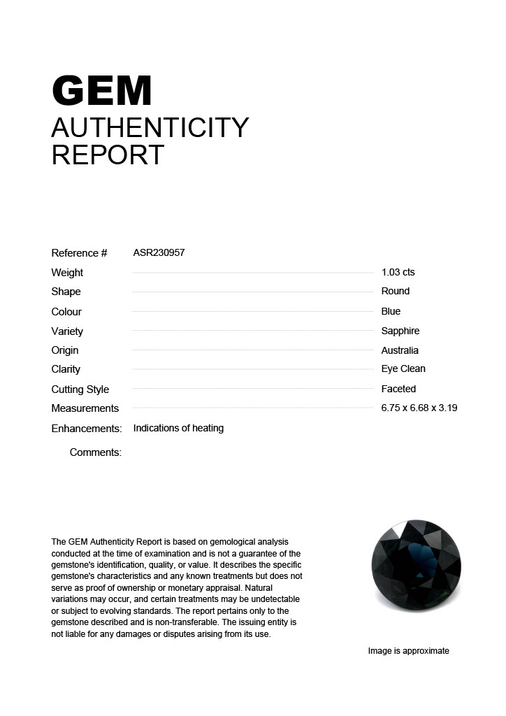 1.03ct Blue Round Australia SapphireCarat: 1.03 ctType: SapphireCut: RoundColour: BlueOrigin: AustraliaComment: Heated6.75 x 6.68 x 3.19 mm