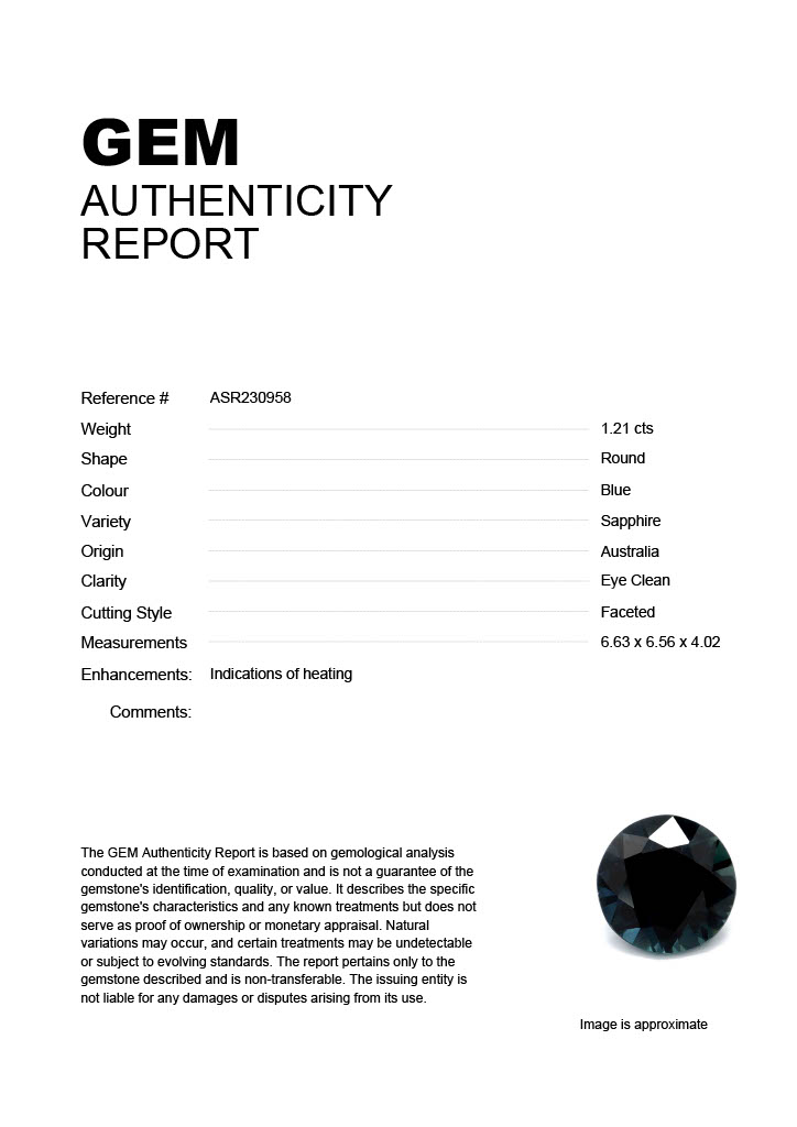 1.21ct Blue Round Australia SapphireCarat: 1.21 ctType: SapphireCut: RoundColour: BlueOrigin: AustraliaComment: Heated6.63 x 6.56 x 4.02 mm