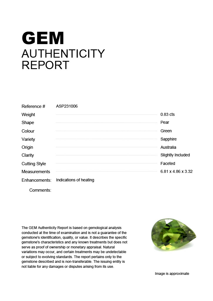 0.83ct Green Pear Australia SapphireCarat: 0.83 ctType: SapphireCut: PearColour: GreenOrigin: AustraliaComment: Heated6.81 x 4.86 x 3.32 mm