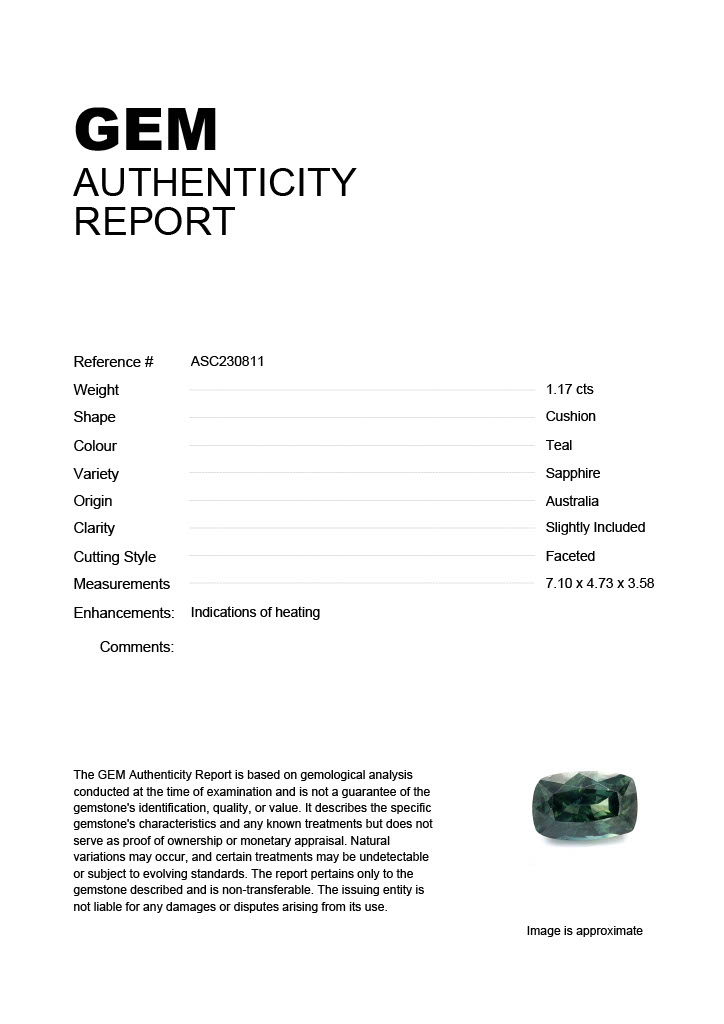 1.17ct Teal Cushion Australia SapphireCarat: 1.17 ctType: SapphireCut: CushionColour: TealOrigin: AustraliaComment: Heated7.10 x 4.73 x 3.58 mm