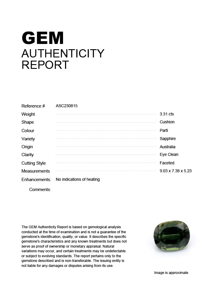 3.31ct Parti Cushion Australia SapphireCarat: 3.31 ctType: SapphireCut: CushionColour: PartiOrigin: AustraliaComment: Not Heated9.03 x 7.38 x 5.23 mm