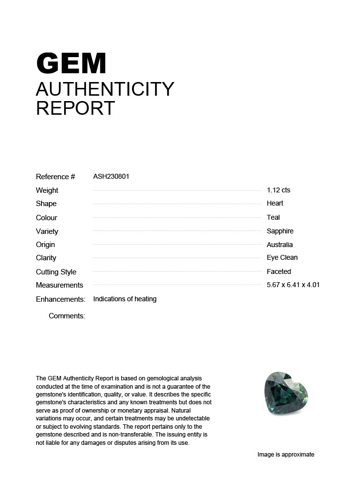 1.12ct Teal Heart Australia SapphireCarat: 1.12 ctType: SapphireCut: HeartColour: TealOrigin: AustraliaComment: Heated5.67 x 6.41 x 4.01 mm