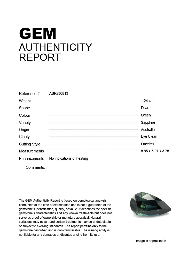 1.24ct Green Pear Australia SapphireCarat: 1.24 ctType: SapphireCut: PearColour: GreenOrigin: AustraliaComment: Not Heated8.85 x 5.01 x 3.78 mm