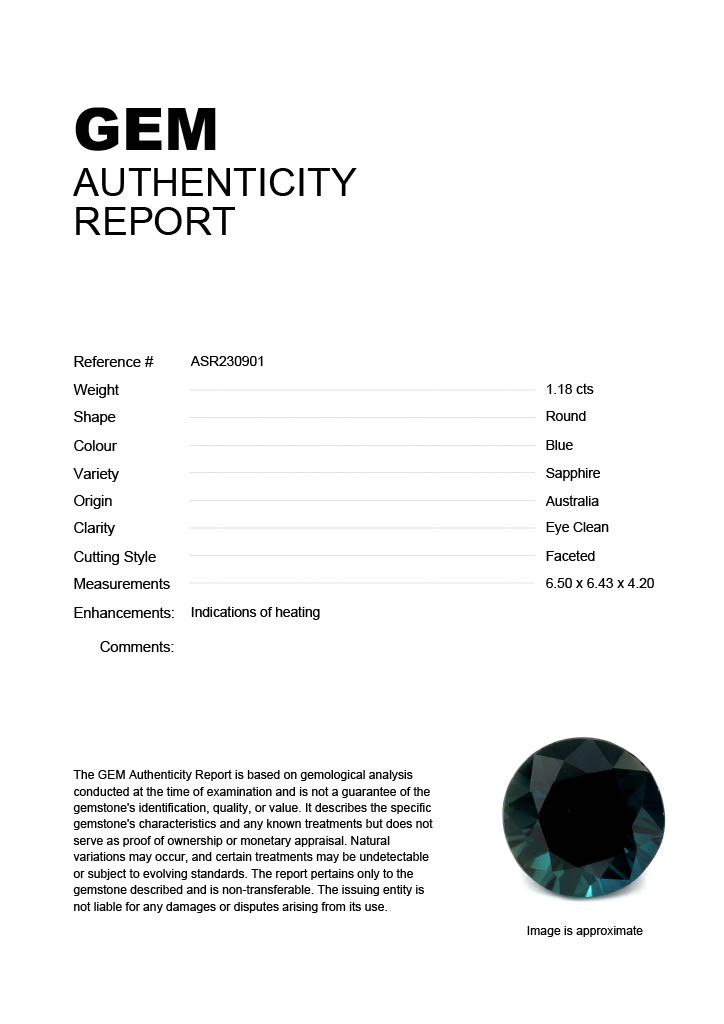 1.18ct Blue Round Australia SapphireCarat: 1.18 ctType: SapphireCut: RoundColour: BlueOrigin: AustraliaComment: Heated6.50 x 6.43 x 4.20 mm