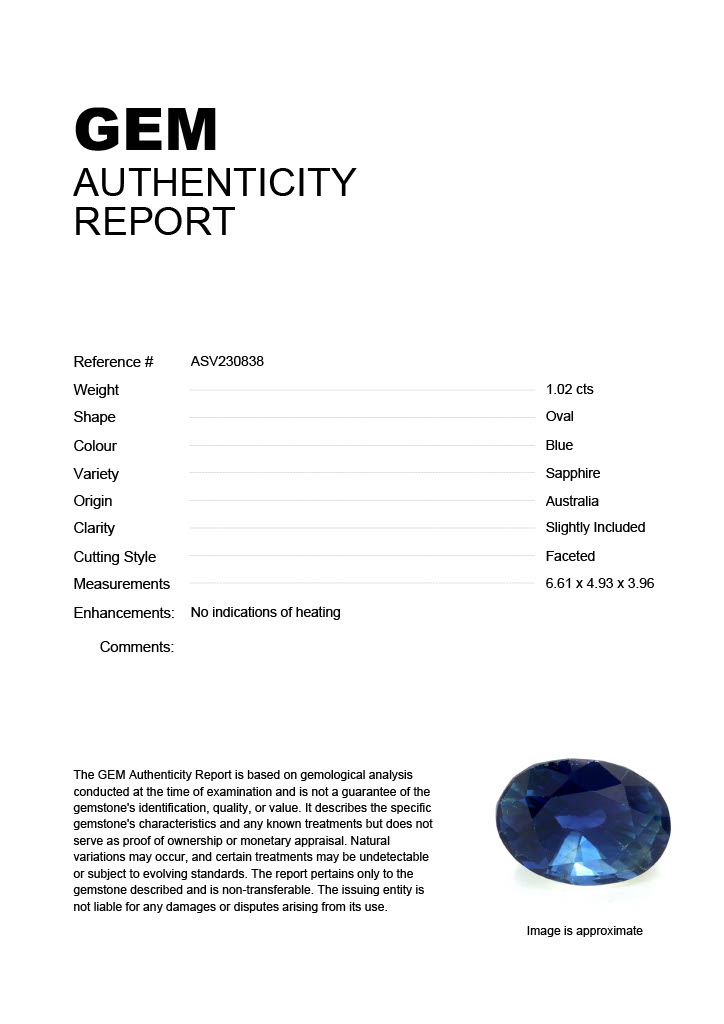 1.02ct Blue Oval Australia SapphireCarat: 1.02 ctType: SapphireCut: OvalColour: BlueOrigin: AustraliaComment: Not Heated6.61 x 4.93 x 3.96 mm