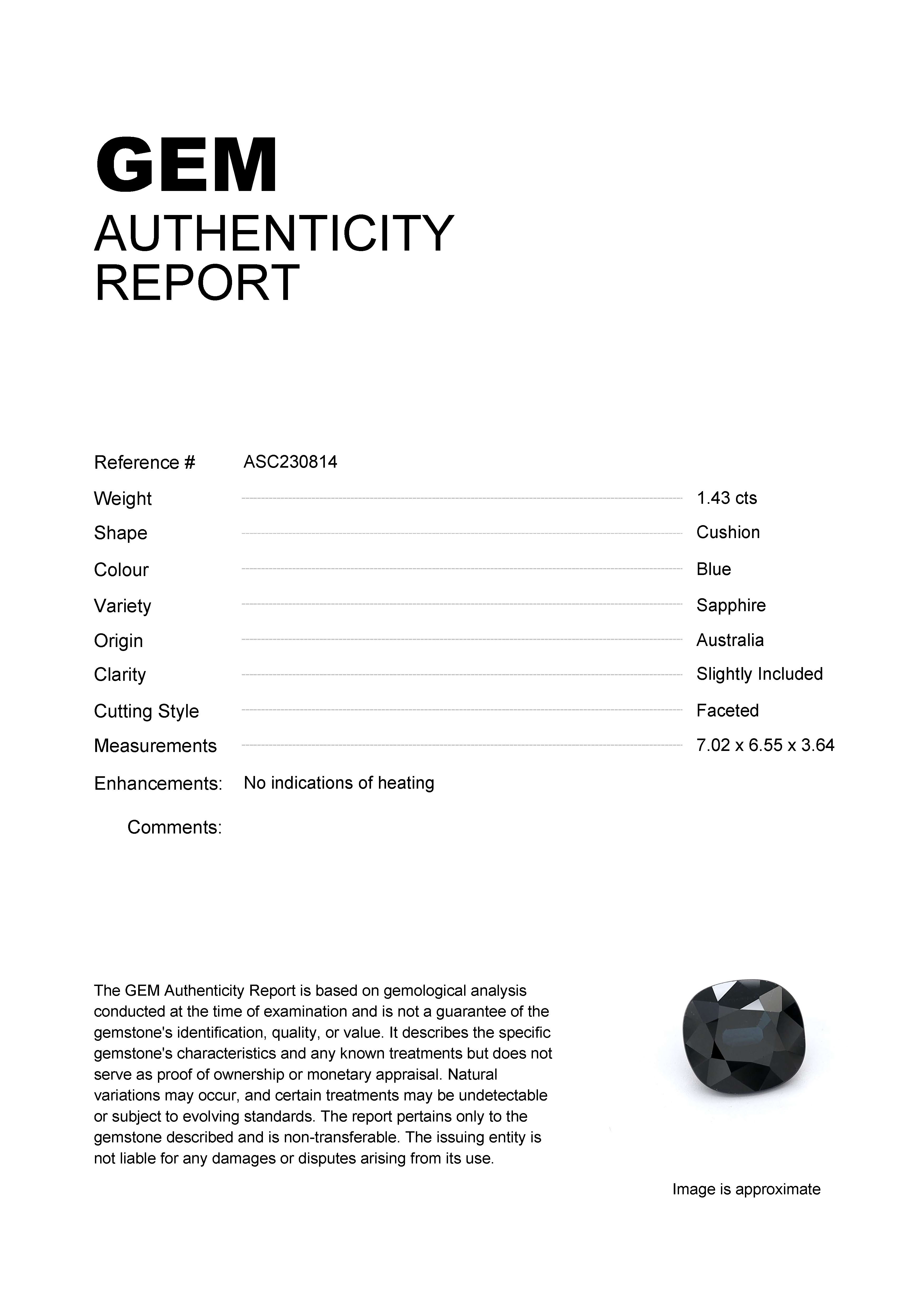 1.43ct Blue Cushion Australia SapphireCarat: 1.43 ctType: SapphireCut: CushionColour: BlueOrigin: AustraliaComment: Not Heated7.02 x 6.55 x 3.64 mm