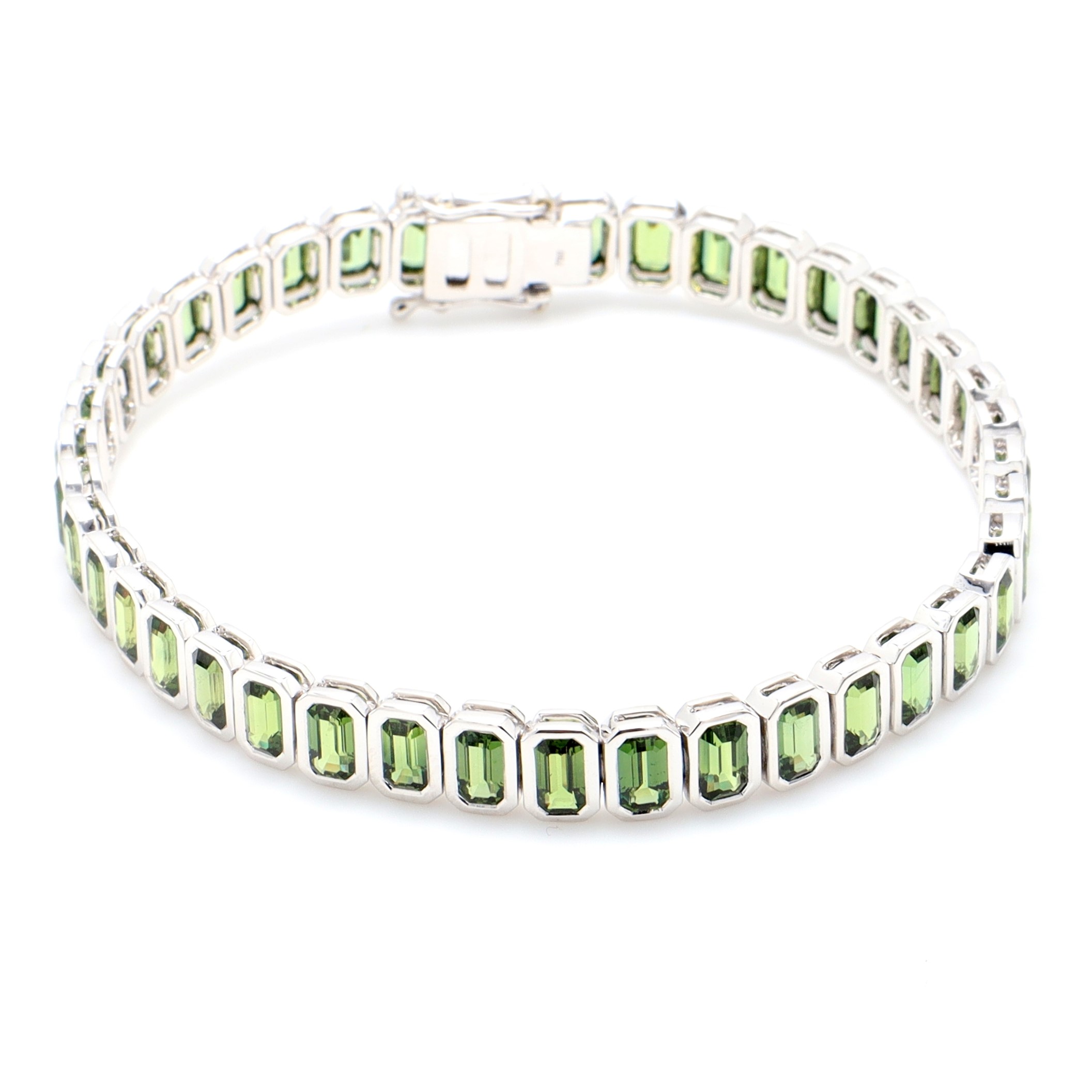 18k WG Bezel set emerald cut Green Sapphires bracelet (Approx TW=12.26ct)-Box clasp double safety18k WG Bezel set emerald cut Green Sapphires bracelet (Approx TW=12.26ct)-Box clasp double safetySize: 18Style ID: 10326GMetal: 18k WGWeight: 18.330gTotal Diamonds: 0 = 0ctTotal Gemstones: 41 = 12.260ct