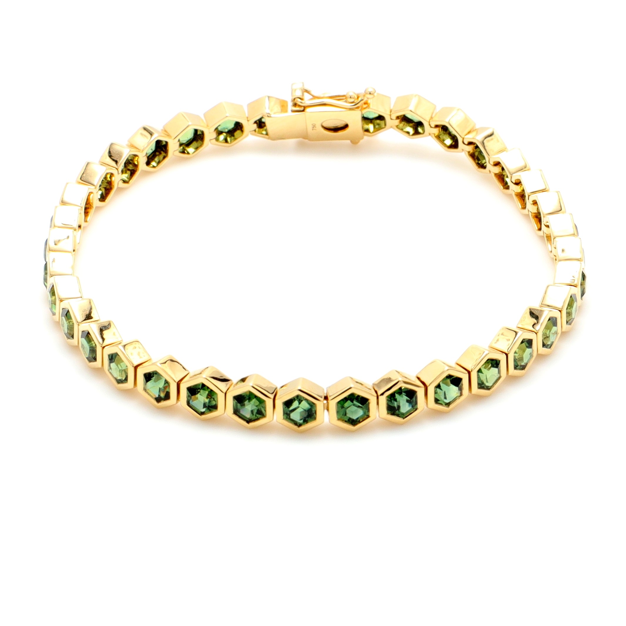18k YG Hexagonal Sapphire bezel set Tennis bracelet – Teal Sapphires (36=8.76ct) – double safety18k YG Hexagonal Sapphire bezel set Tennis bracelet - Teal Sapphires (36=8.76ct) - double safetySize: 18Style ID:Metal: 18k YGWeight: 15.680gTotal Diamonds: 0 = 0ctTotal Gemstones: 36 = 8.760ct