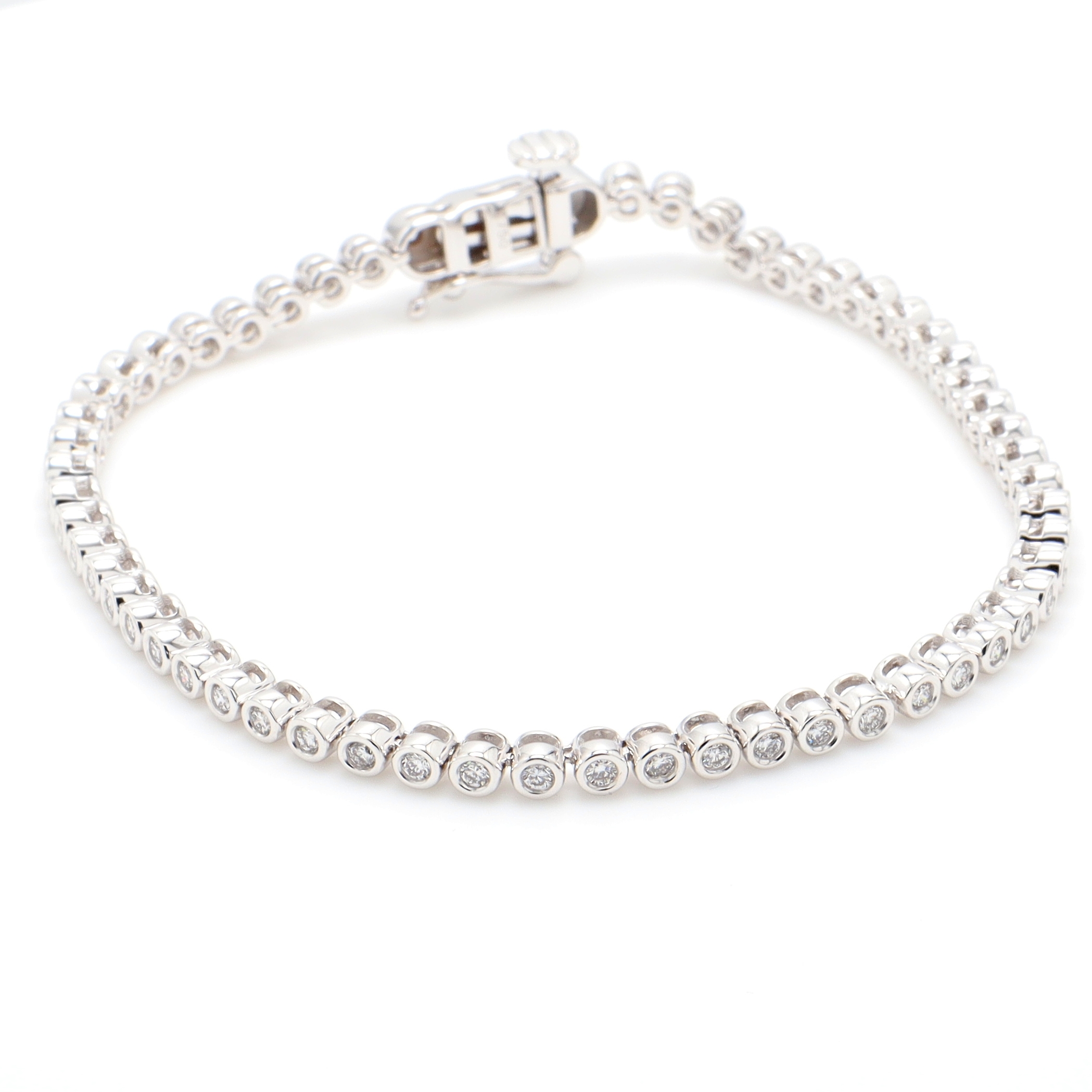 18k WG FULL LENGTH Bezel set Tennis Bracelet set with RBC LAB GROWN Diamonds EF/VS 59=1.06ct18k WG FULL LENGTH Bezel set Tennis Bracelet set with RBC LAB GROWN Diamonds EF/VS 59=1.06ctSize: 18Style ID:Metal: 18k WGWeight: 11.920gTotal Diamonds: 59 = 1.060ctTotal Gemstones: 0 = 0ct