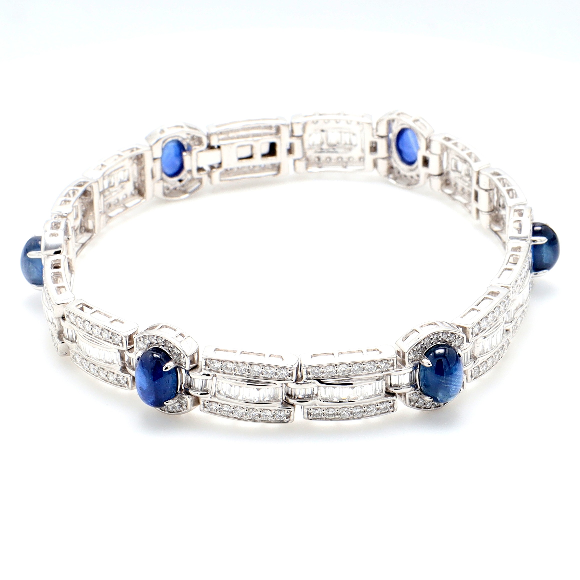 Platinum Art Deco Bracelet set with 6=7.62ct Oval Cab Thai Blue Sapp with Baguette & RBC Nat Diamonds G/VS-SI 363=3.63ctPlatinum Art Deco Bracelet set with 6=7.62ct Oval Cab Thai Blue Sapp with Baguette & RBC Nat Diamonds G/VS-SI 363=3.63ctSize: 18Style ID: CustomMetal: PlatinumWeight: 33.000gTotal Diamonds: 363 = 3.630ctTotal Gemstones: 6 = 7.620ct