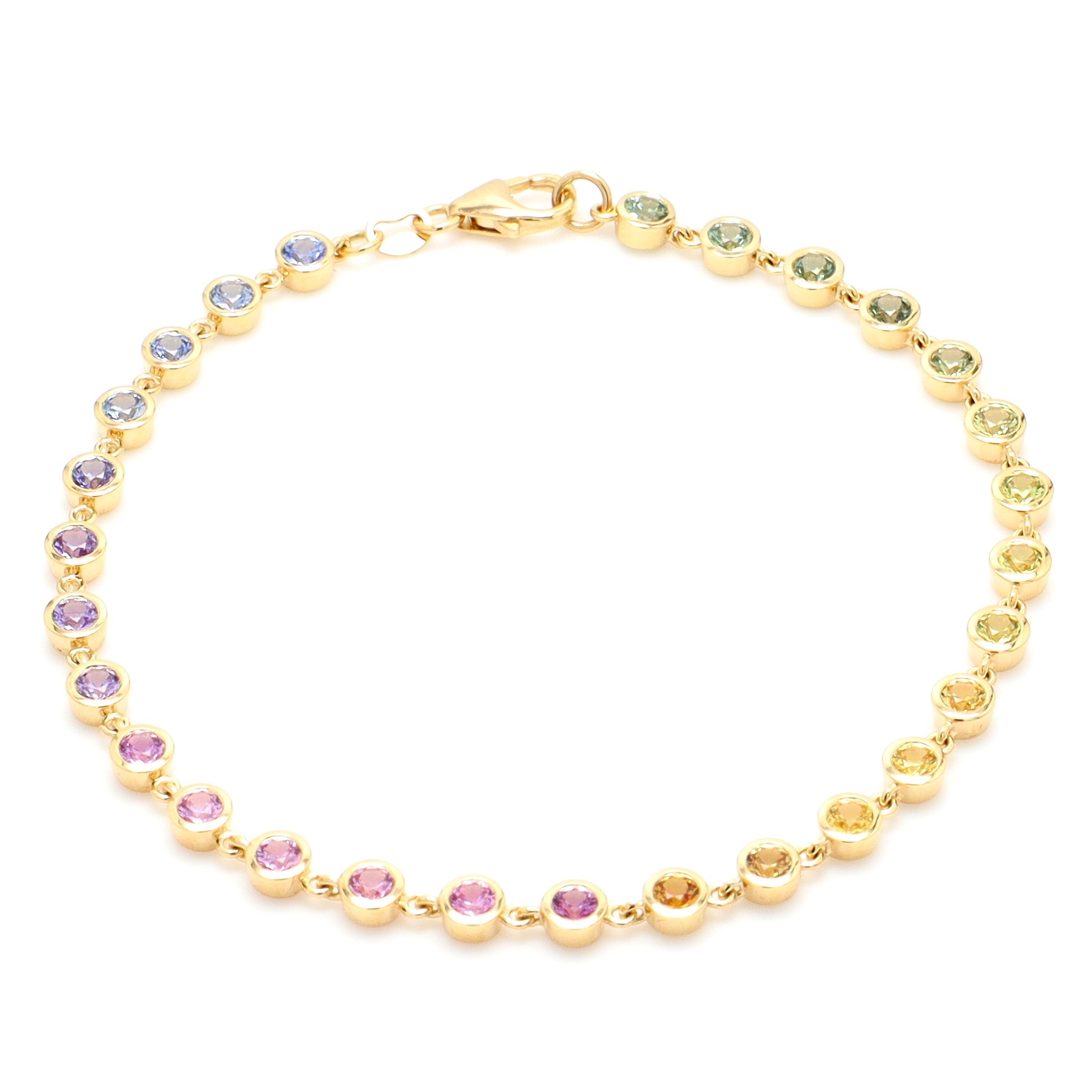 18k YG Bezel set Bubble bracelet set with RBC Rainbow Sapphires 28=3.06ct18k YG Bezel set Bubble bracelet set with RBC Rainbow Sapphires 28=3.06ctSize: 18Style ID:Metal: 18k YGWeight: 6.100gTotal Diamonds: 0 = 0ctTotal Gemstones: 28 = 3.060ct