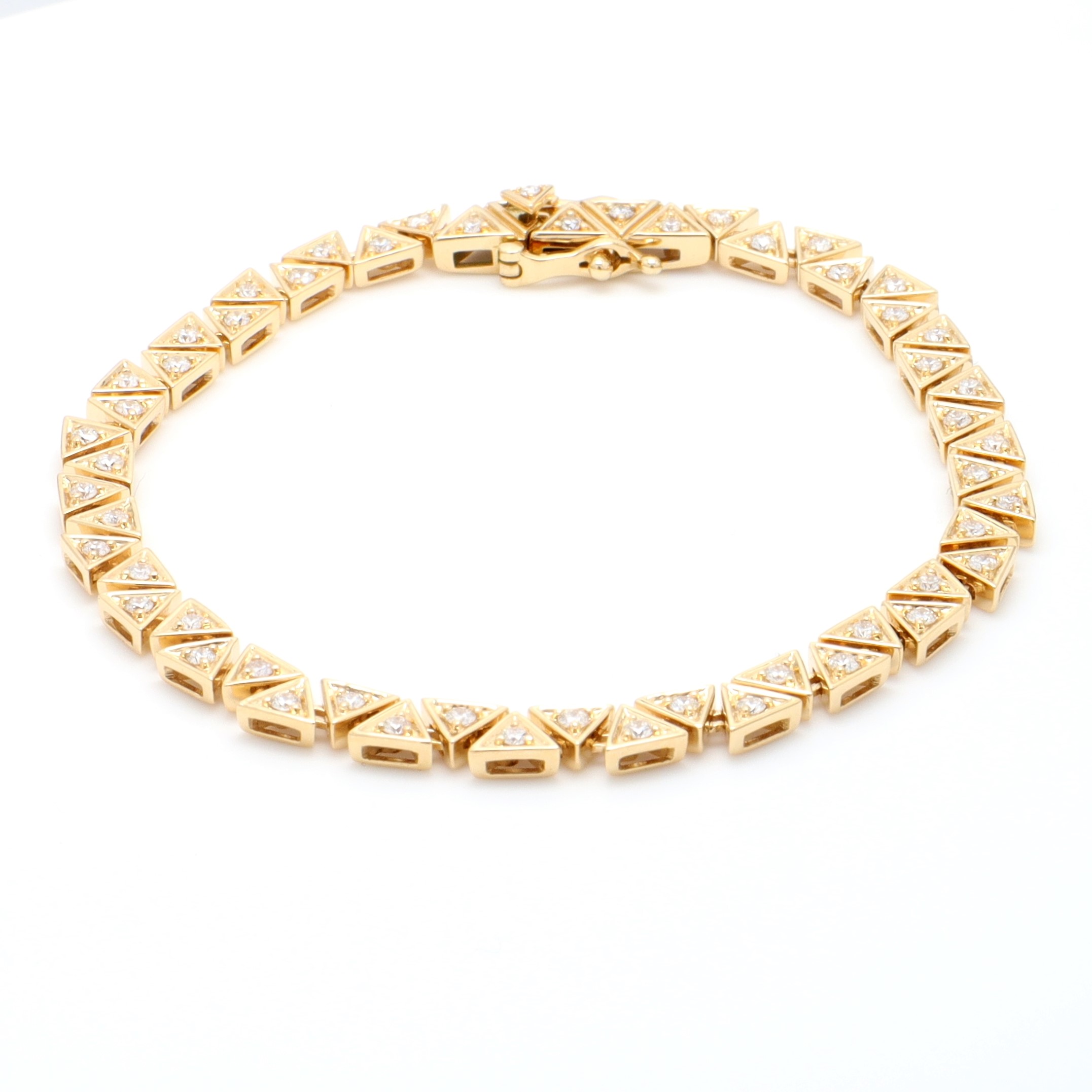18k YG Triangle Tennis bracelet with RBC Nat Diamonds G/SI (Approx TDW= 1.06ct)- Box clasp double safety18k YG Triangle Tennis bracelet with RBC Nat Diamonds G/SI (Approx TDW= 1.06ct)- Box clasp double safetySize: 18Style ID: AIDB00937Metal: 18k YGWeight: 14.820gTotal Diamonds: 54 = 1.060ctTotal Gemstones: 0 = 0ct