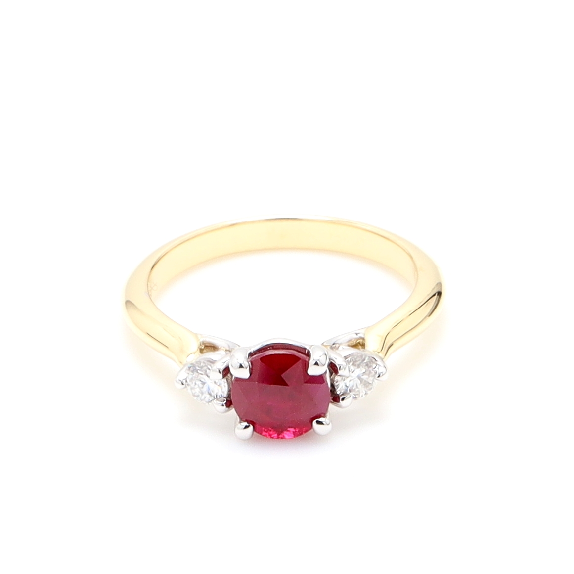 18k WG/YG Trellis style trilogy ring set with 1.31ct RBC Mozambique Ruby & 3mm RBC Nat Diamonds G/SI(Approx TDW= 0.21ct)18k WG/YG Trellis style trilogy ring set with 1.31ct RBC Mozambique Ruby & 3mm RBC Nat Diamonds G/SISize: LStyle ID: TR0010Metal: 18k WG/YGWeight: 4.220gTotal Diamonds: 2 = 0.240ctTotal Gemstones: 1 = 1.310ct