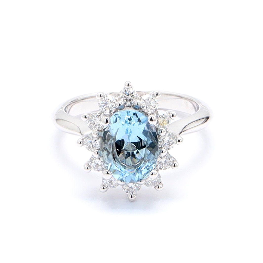 18k WG Cluster style ring set with 1.68ct Oval Aqua with 2.20mm RBC Nat Diamonds G/SI (Approx TDW= 0.51ct)