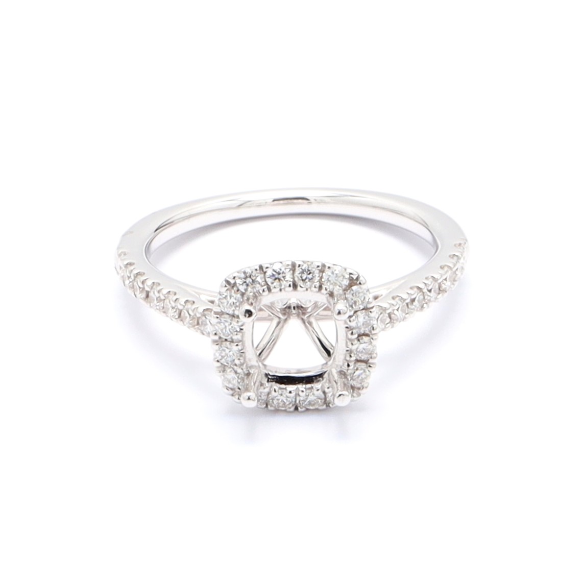 SEMI MOUNT – Cushion Halo style ring with diamonds half band (Approx TDW= 0.44ct) – to suit 1ct RBC