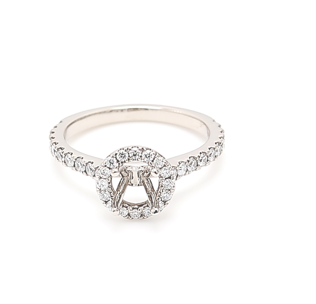 SEMI MOUNT – 4 claw split claw halo set with 2/3 band diamonds (Approx TDW= 0.62ct)- to suit 2ct RBC